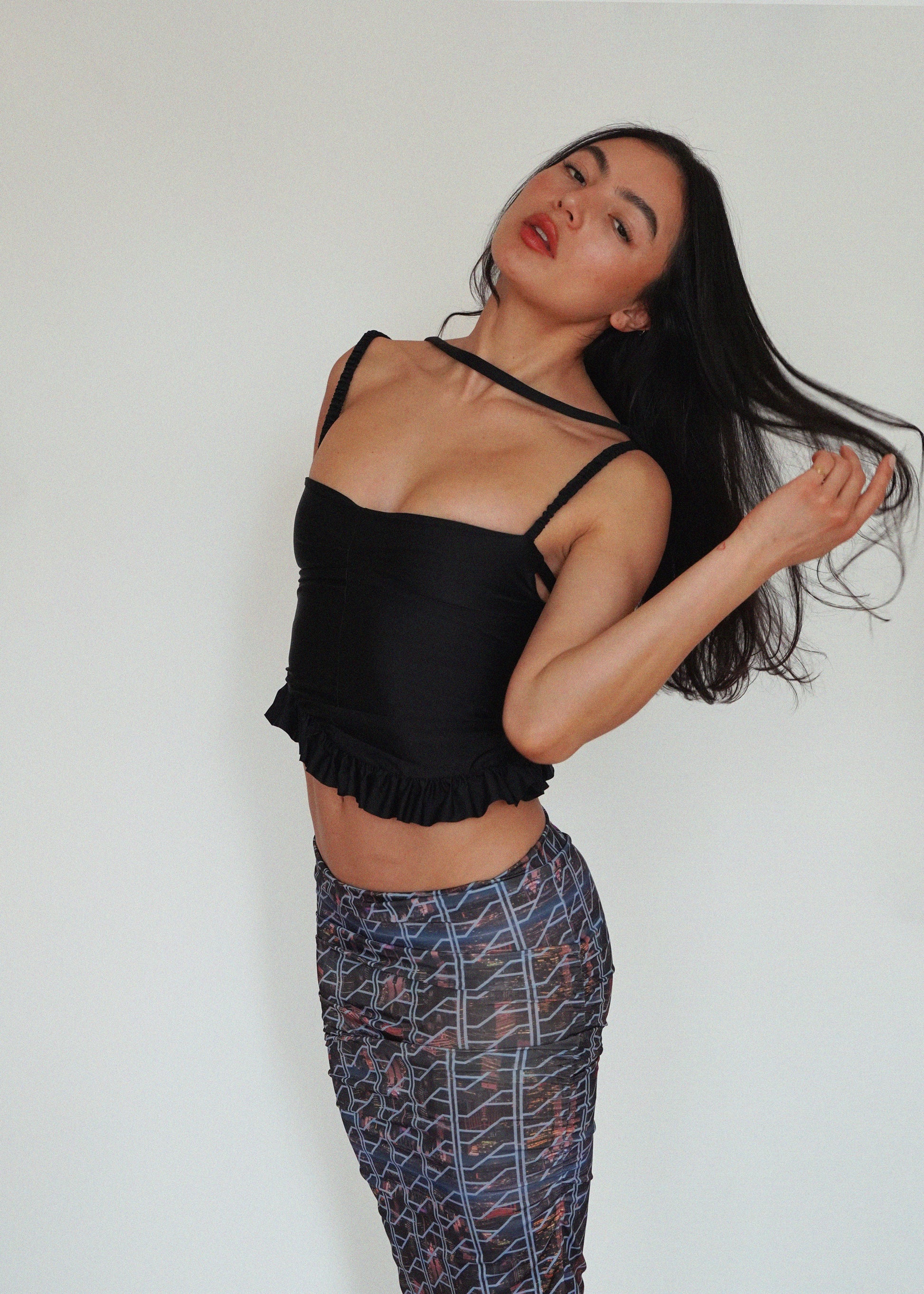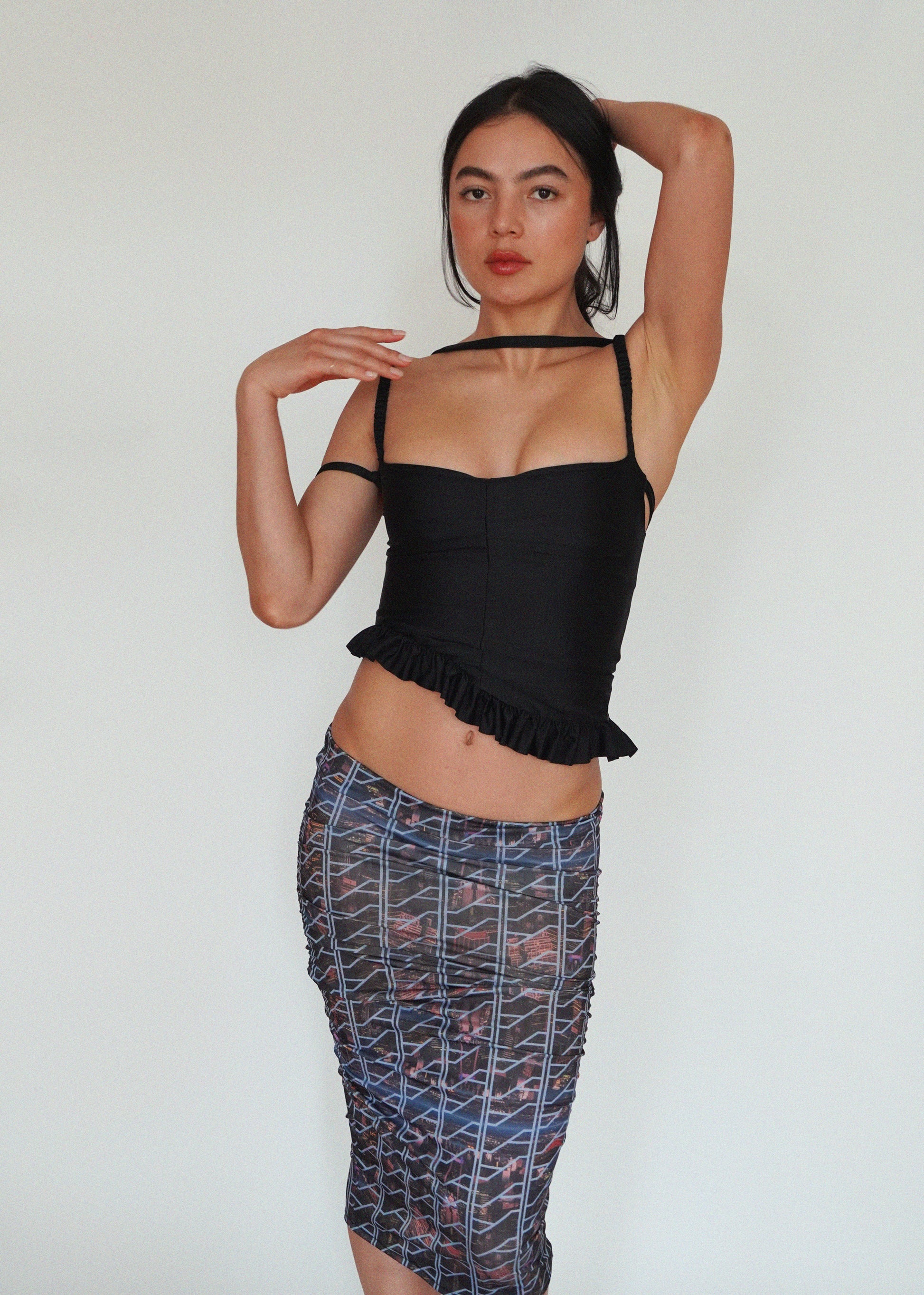 The Alexandrina Top, this beauty was inspired by the Bianca Dress as you may have noticed. Balconette cleavage, asymmetrical cut, ruffles, plus our signature scrunchie straps and endless strings to tie in a million different ways! Wear is as a regular top or match it with a bikini bottom and wear it as a swim top. This piece is fully lined.