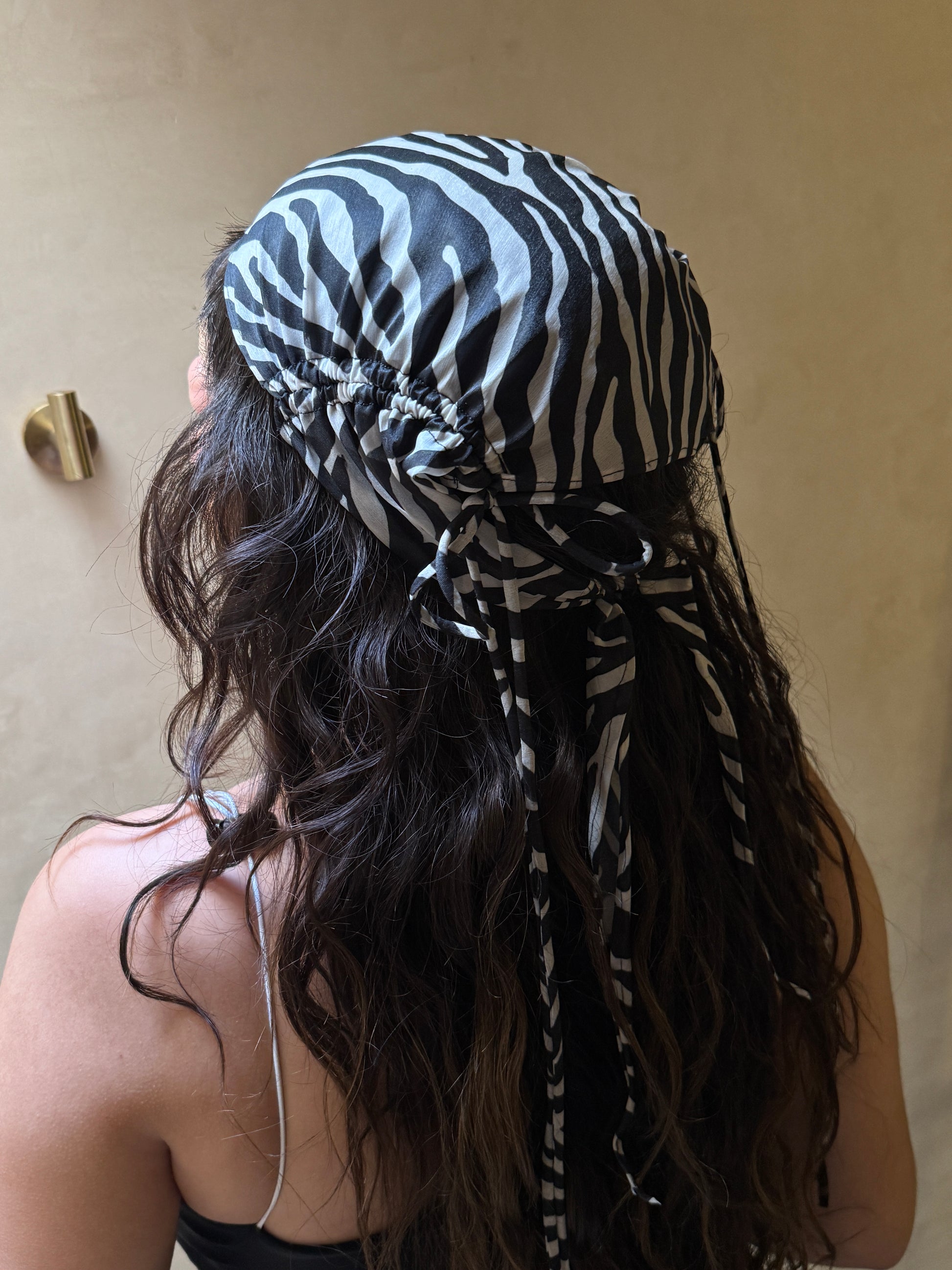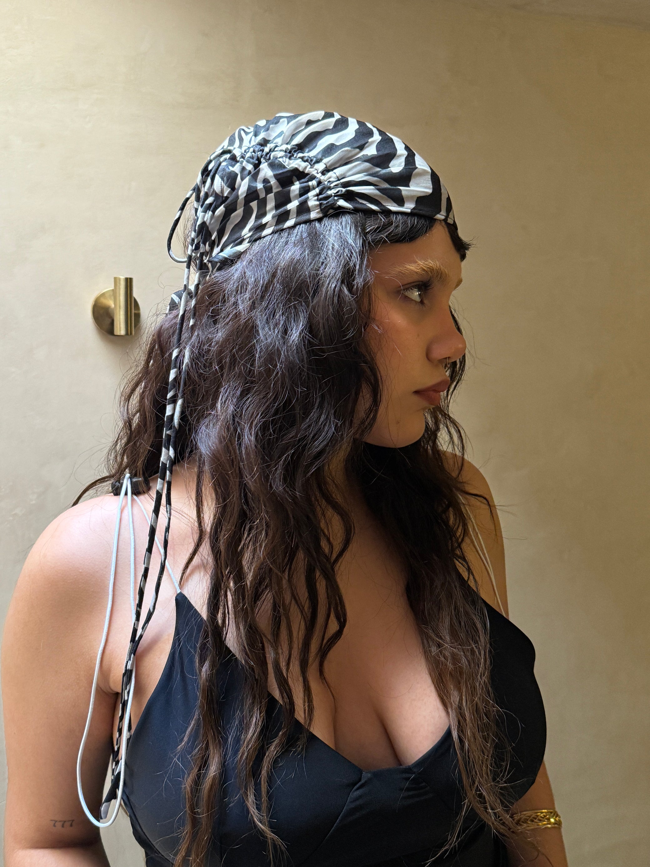 Semi transparent, adjustable string headscarf.