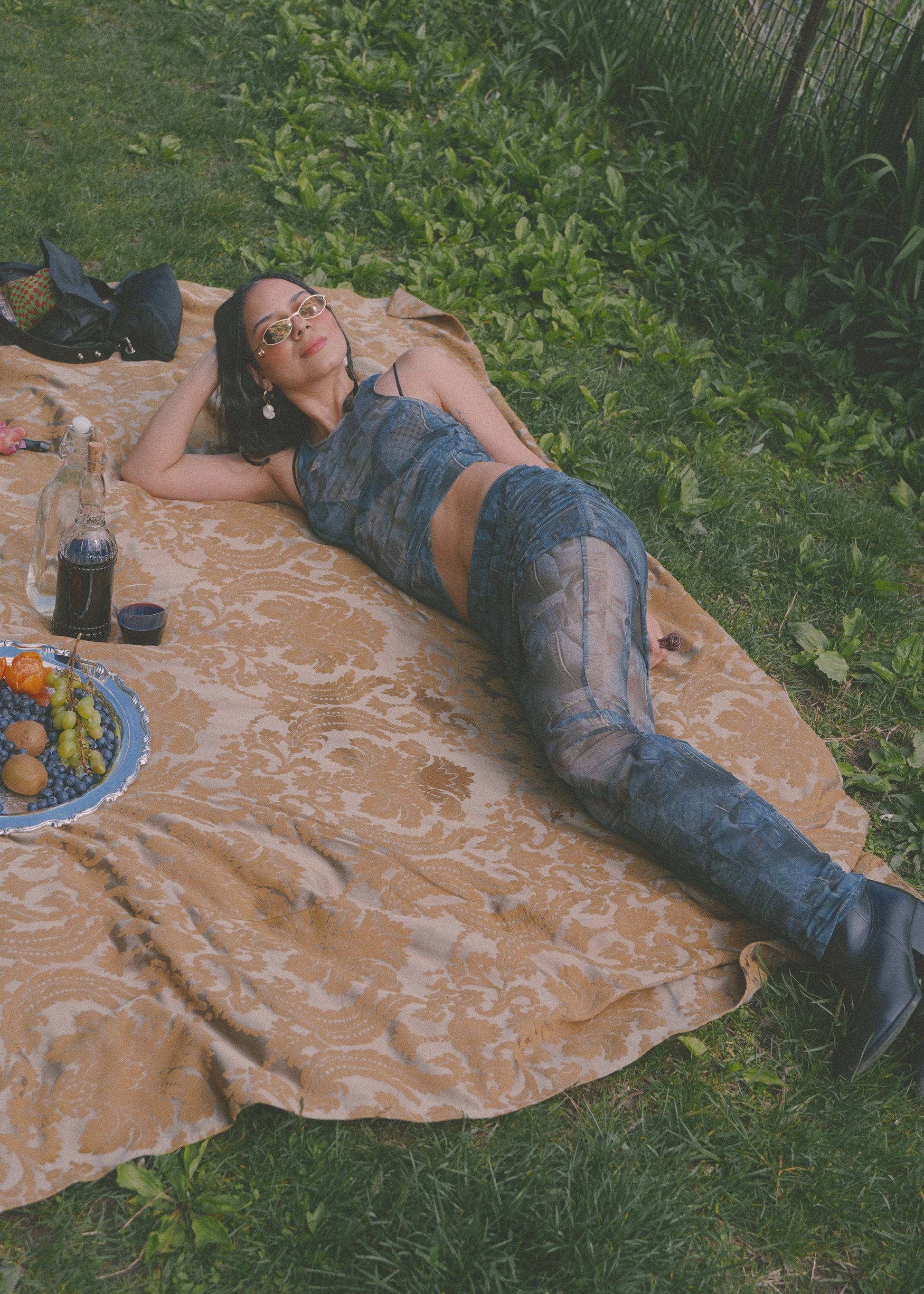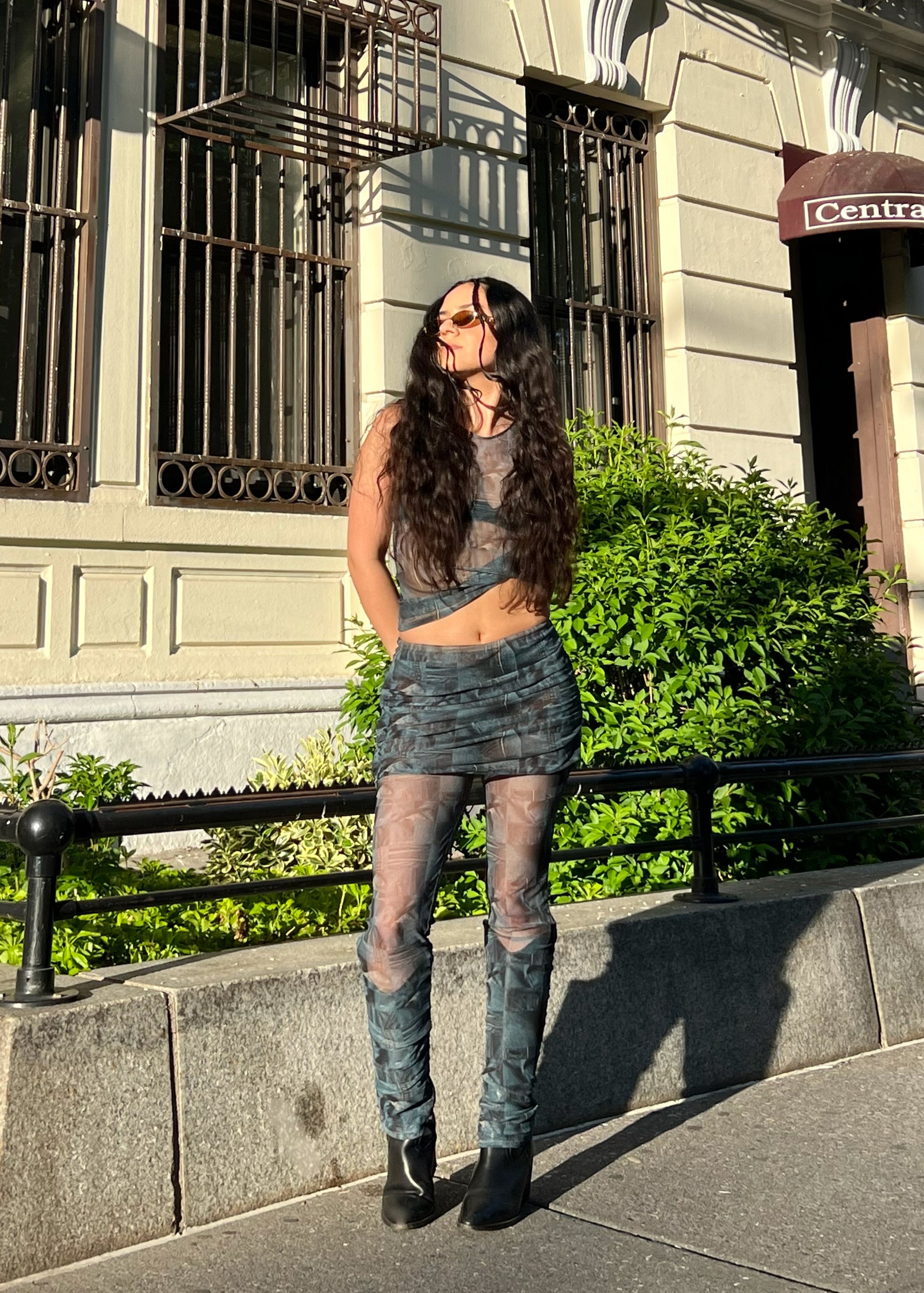 Low waisted mesh pants with a mini skirt layer.