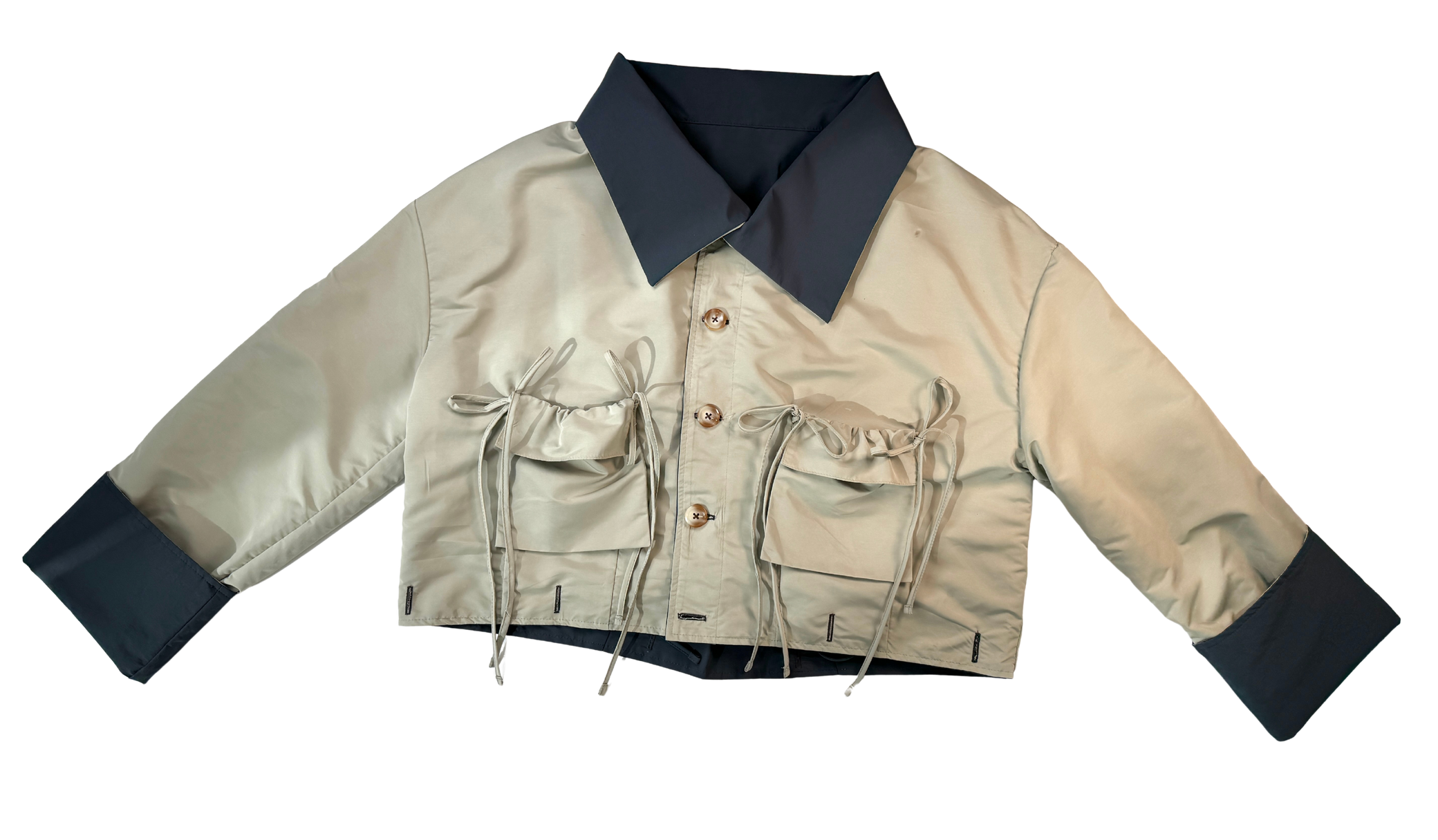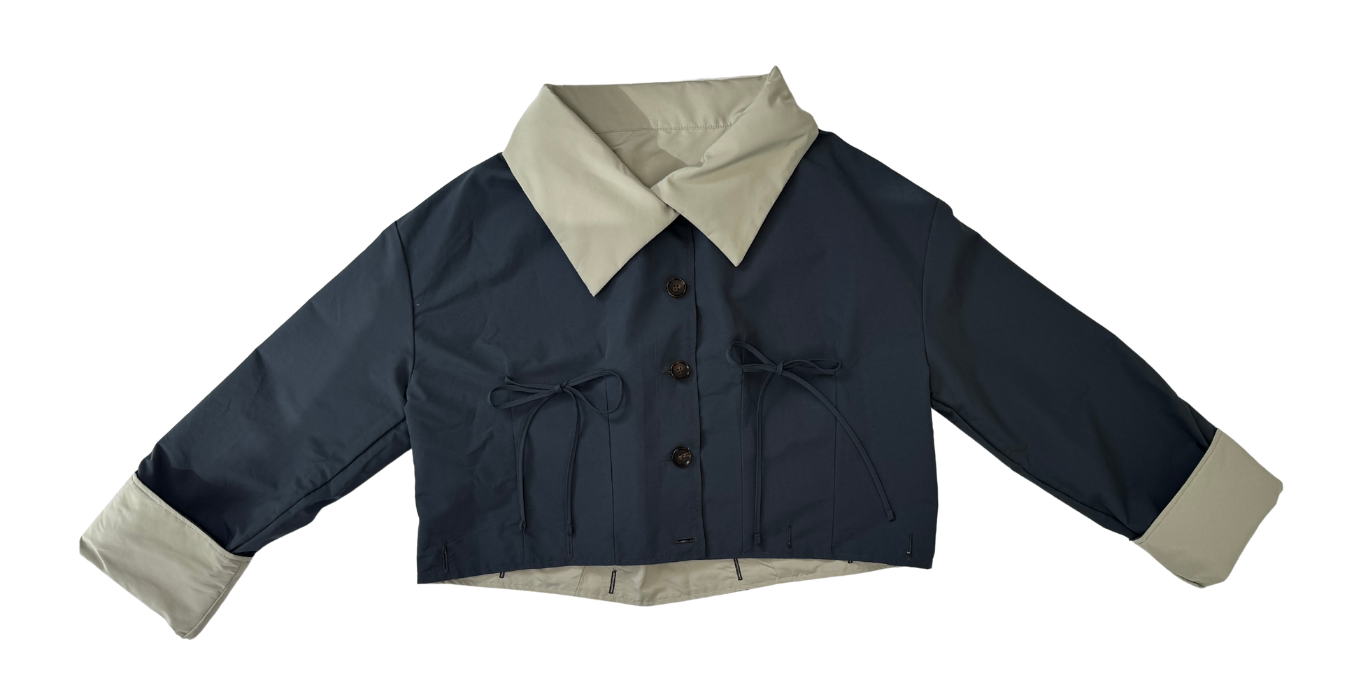 Versatile, water repellent, reversible hip length (extendable) jacket to coat. Dropped shoulders, removable pockets. Adjustable string on the back, foldover collar and full button closure. Made and designed in New York City by Valeria Anastasia and Leslye Rae. Build your coat to your preferable length with the Rain Mini or Rain Skirt (sold separately).