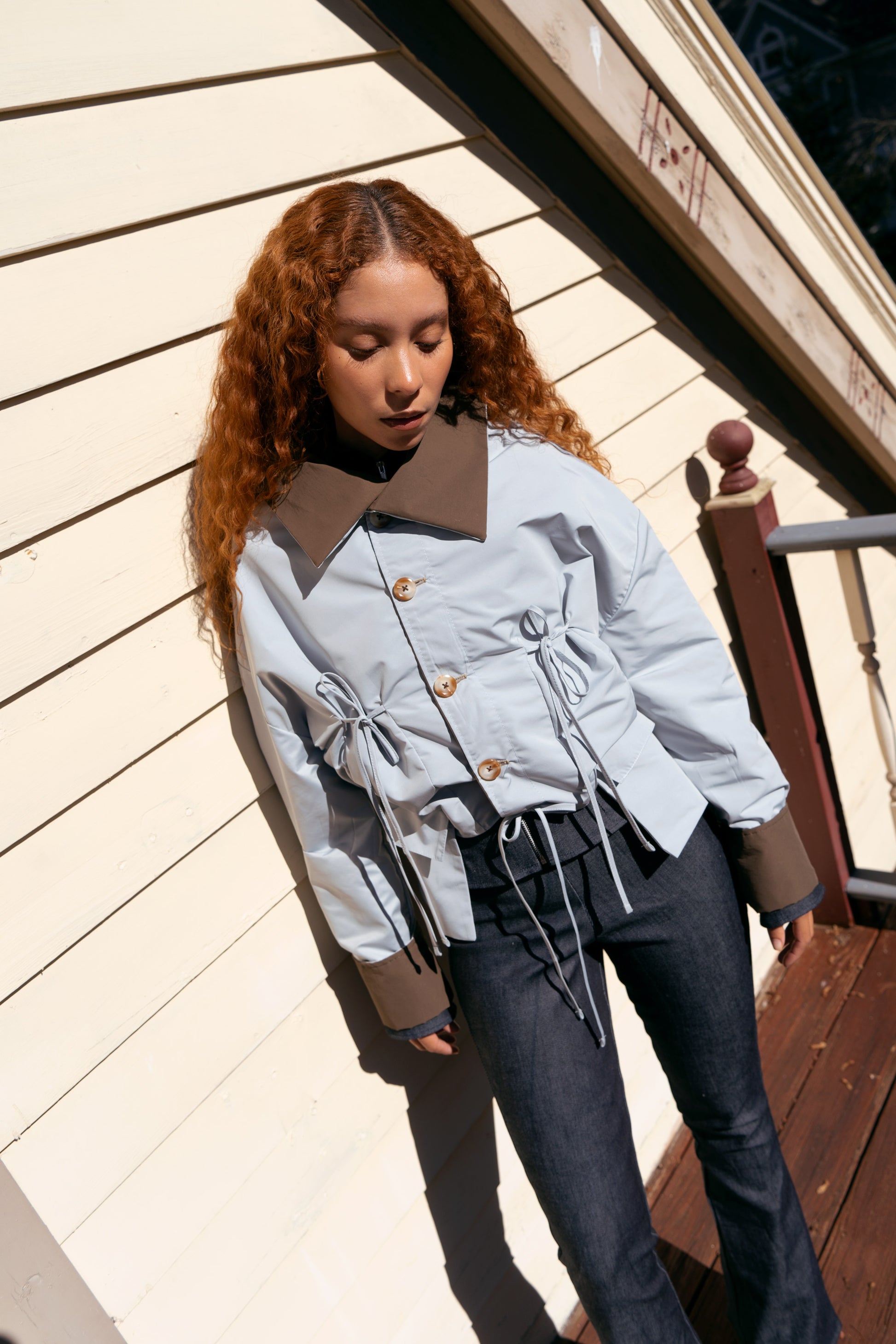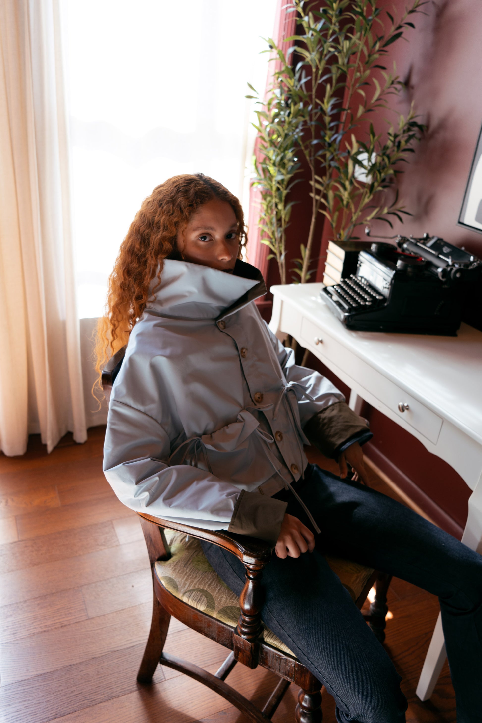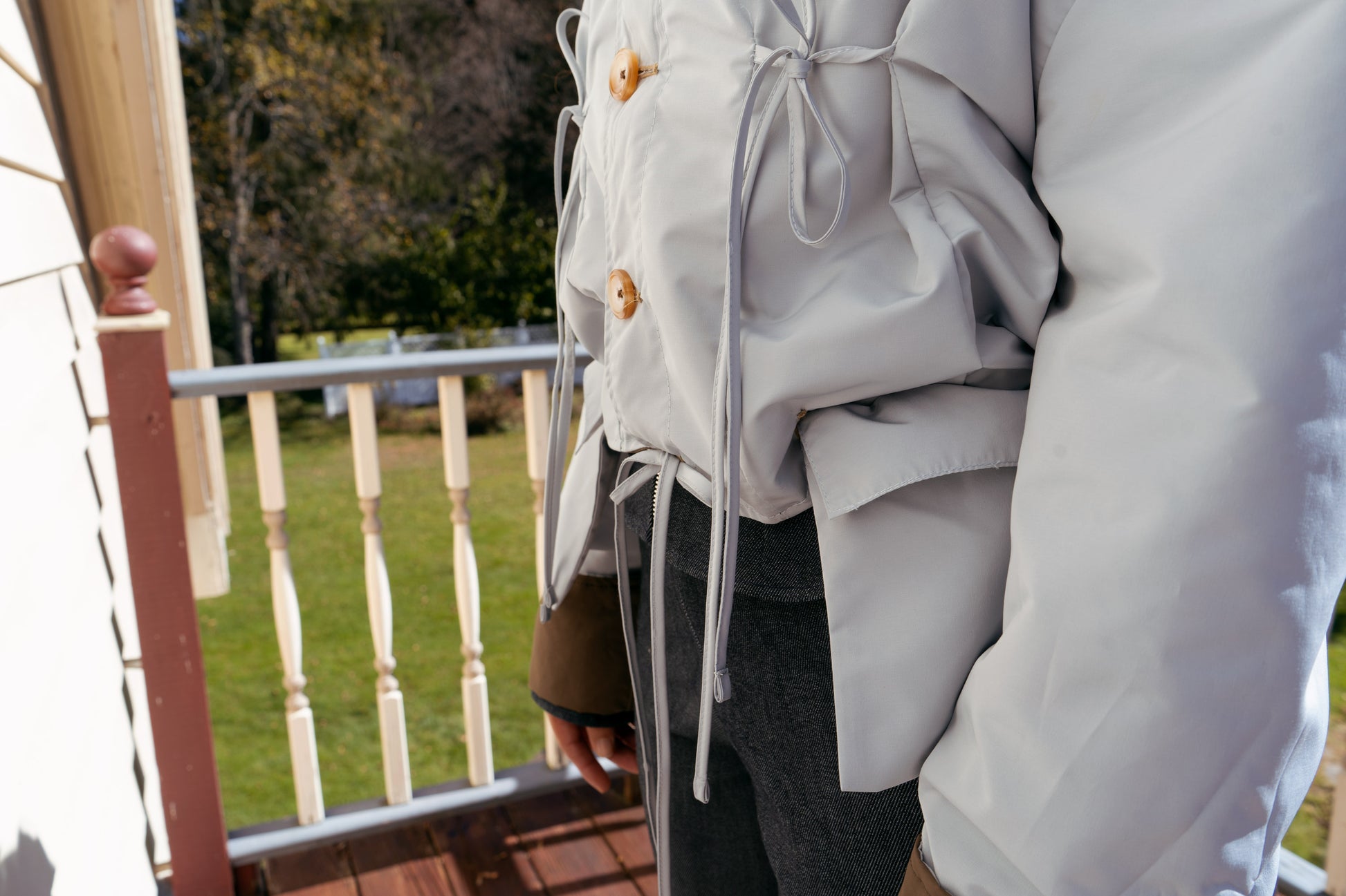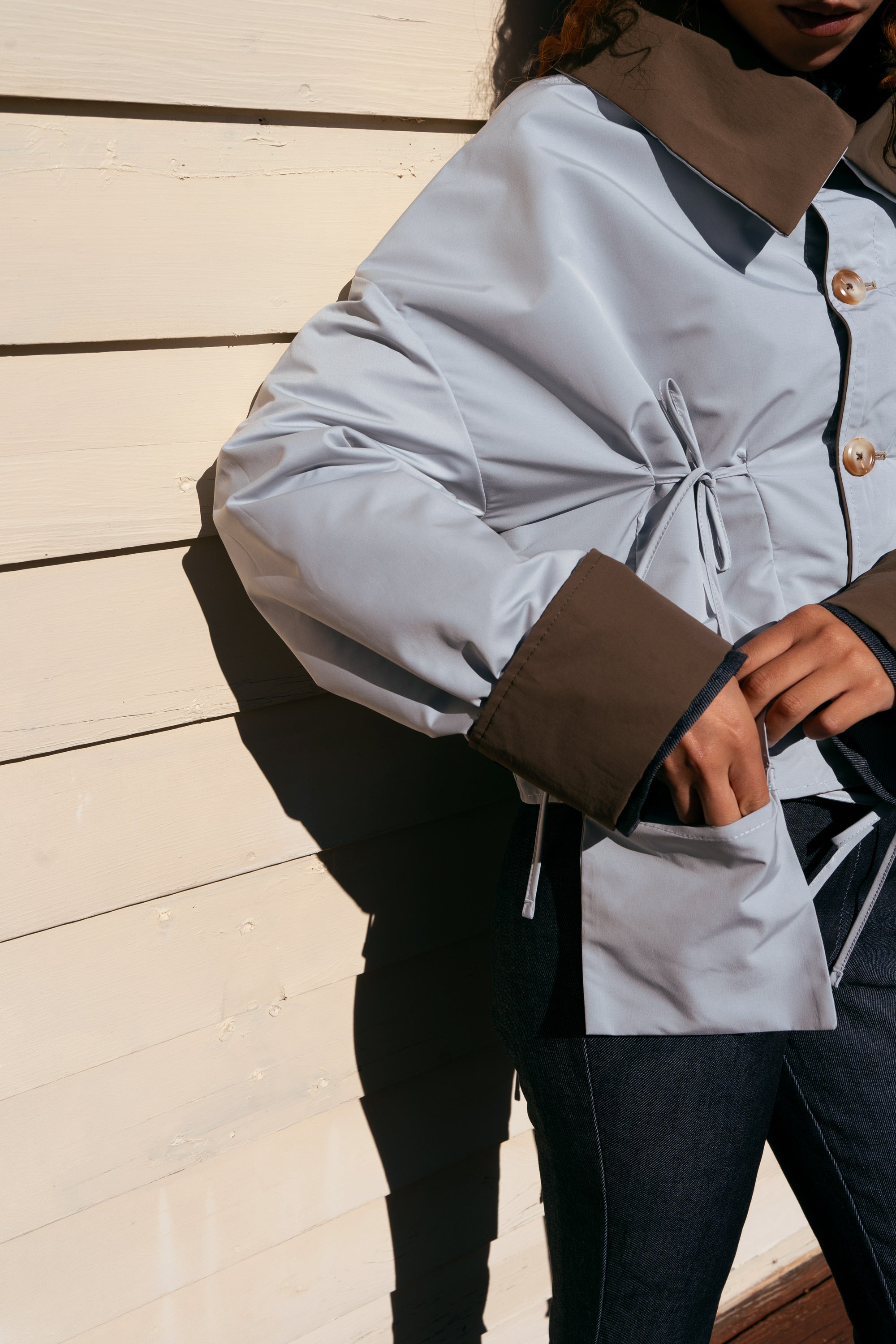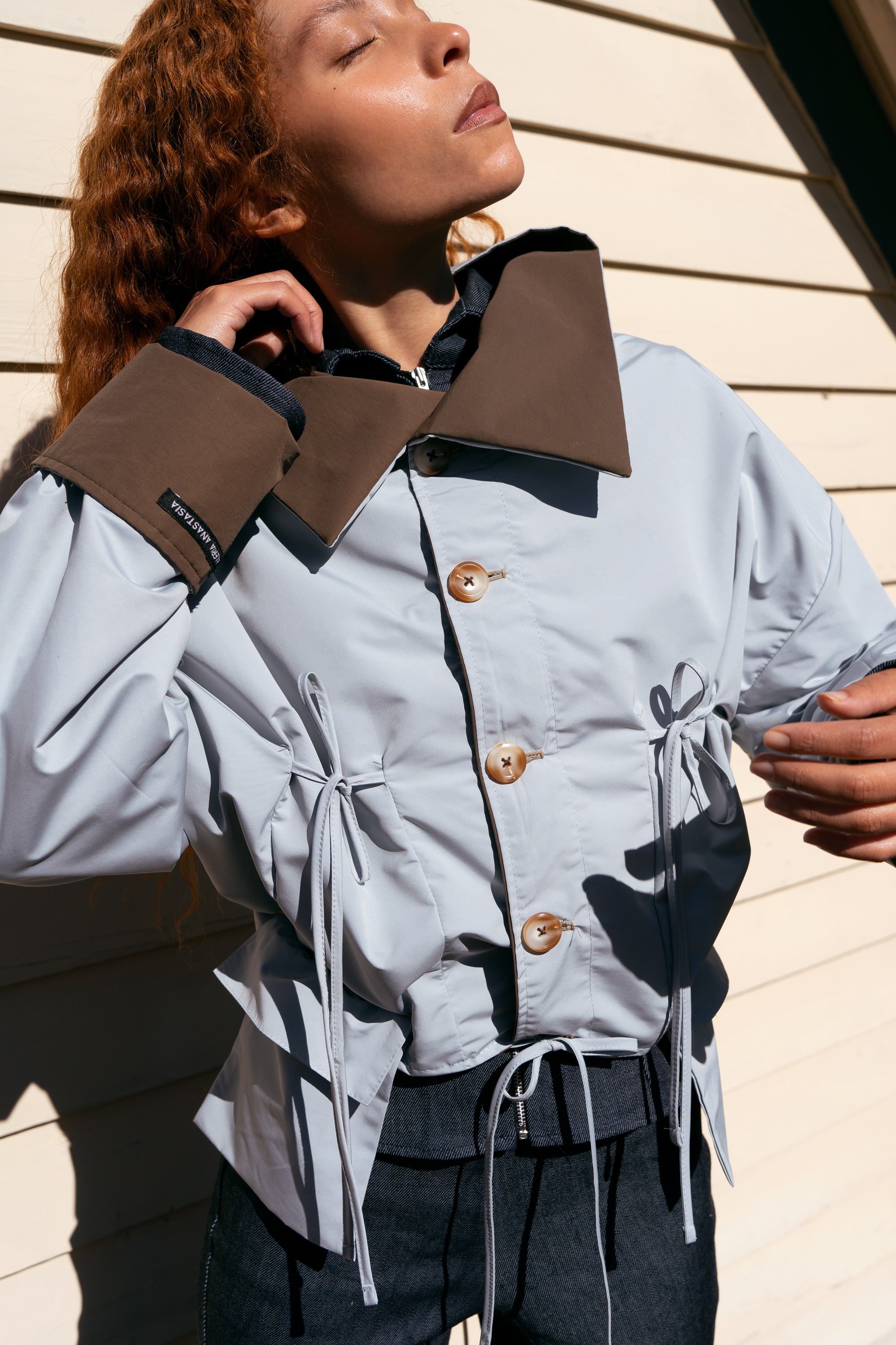 Versatile, water repellent, reversible hip length (extendable) jacket. Dropped shoulders, removable pockets. Adjustable string on the back, foldover collar and full button closure. Made and designed in New York City by Valeria Anastasia and Leslye Rae. Build your coat to your preferable length with the Rain Mini or Rain Skirt (sold separately).