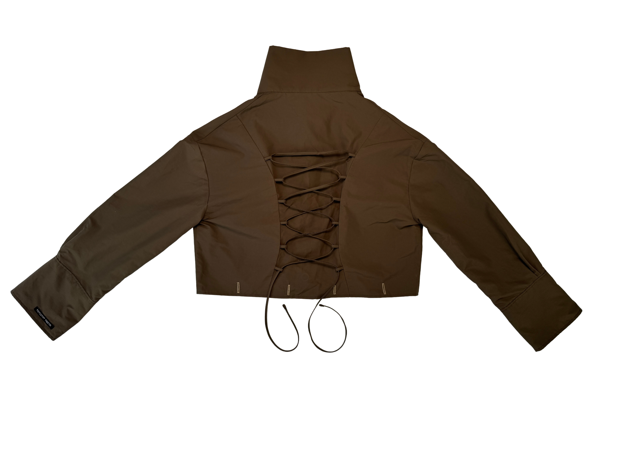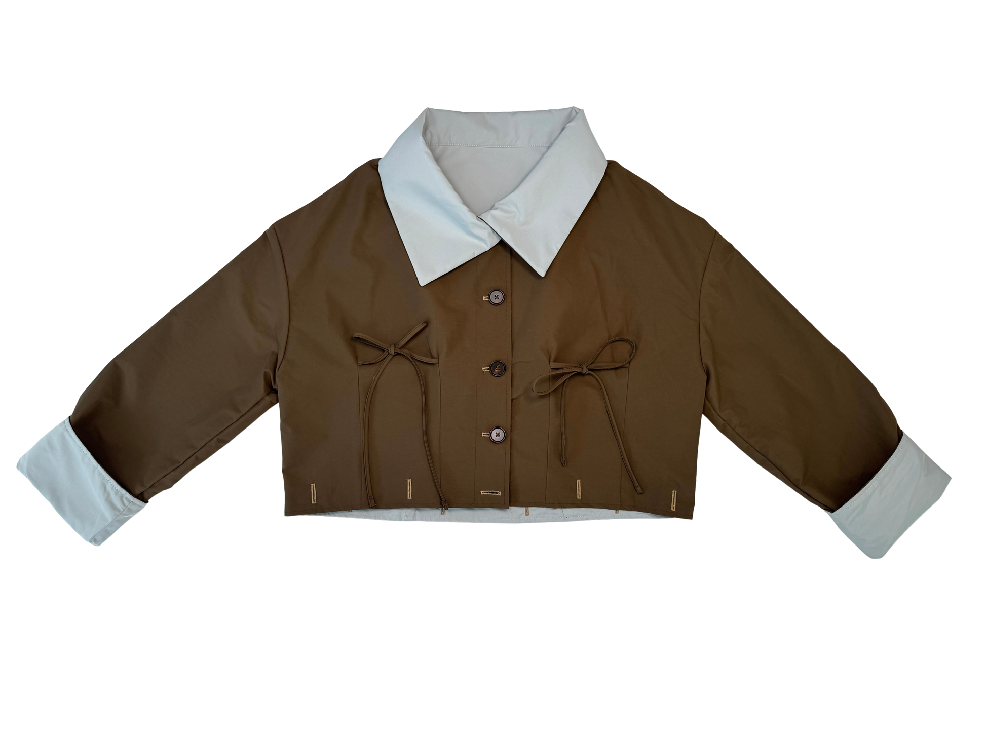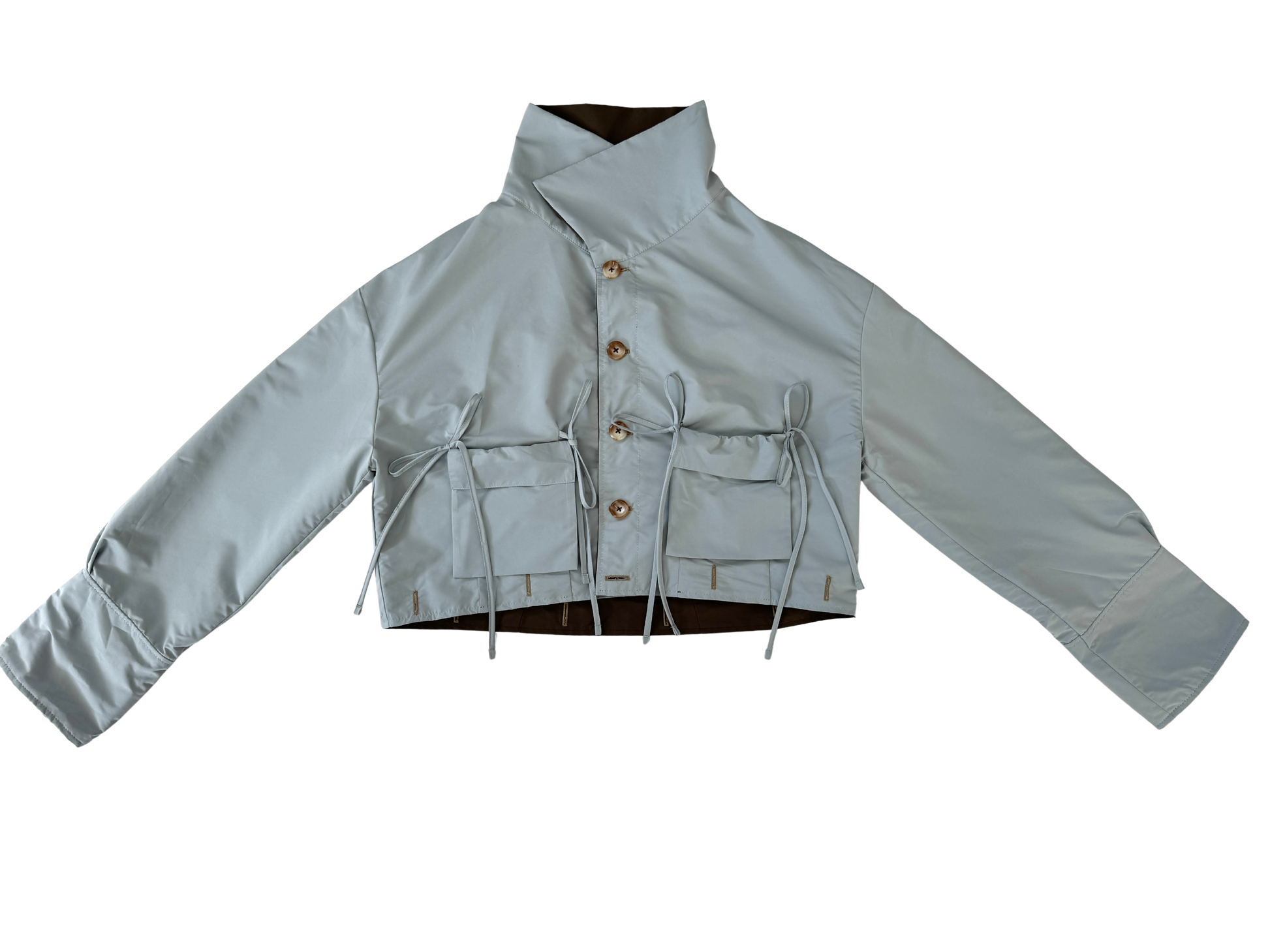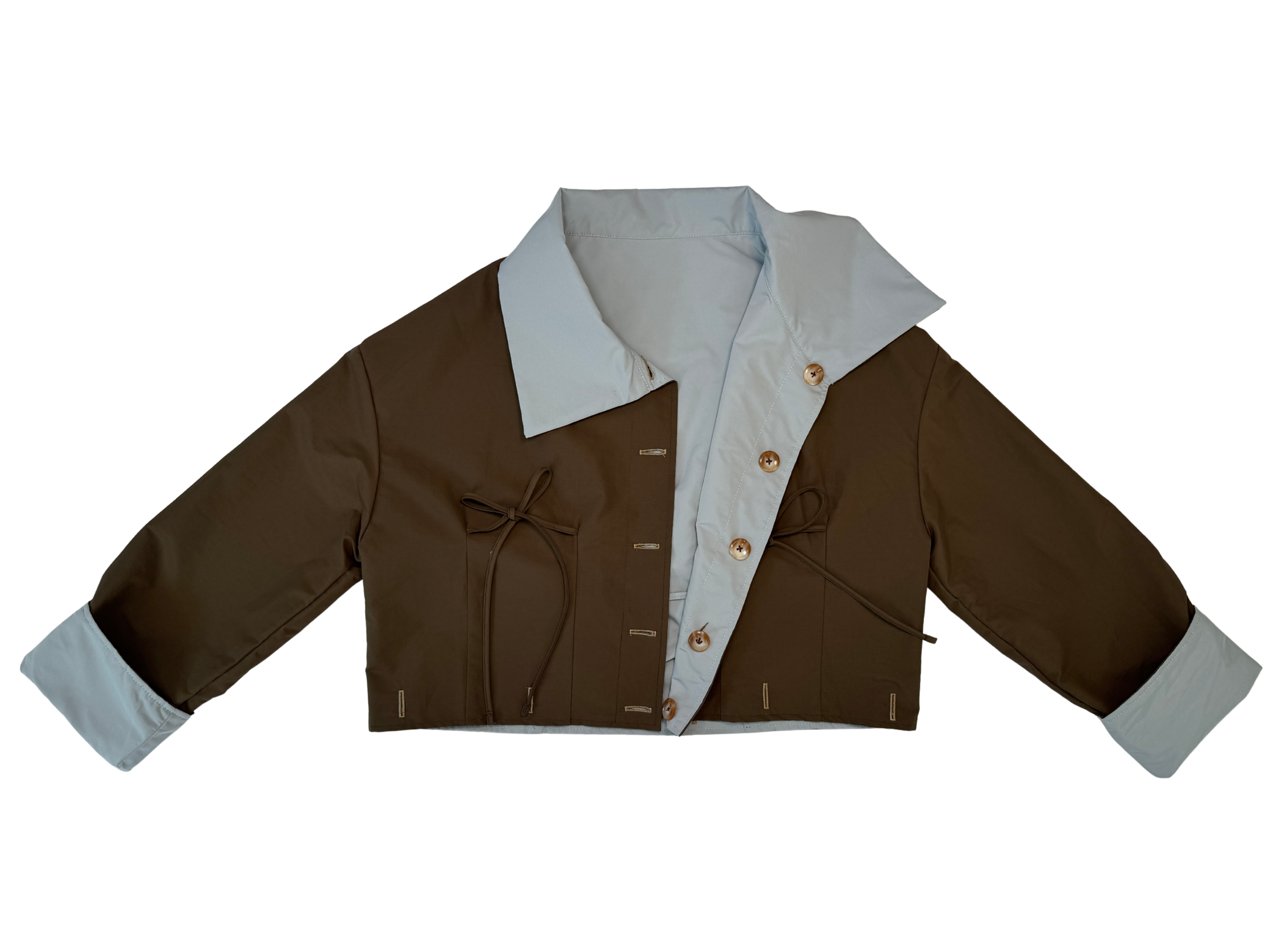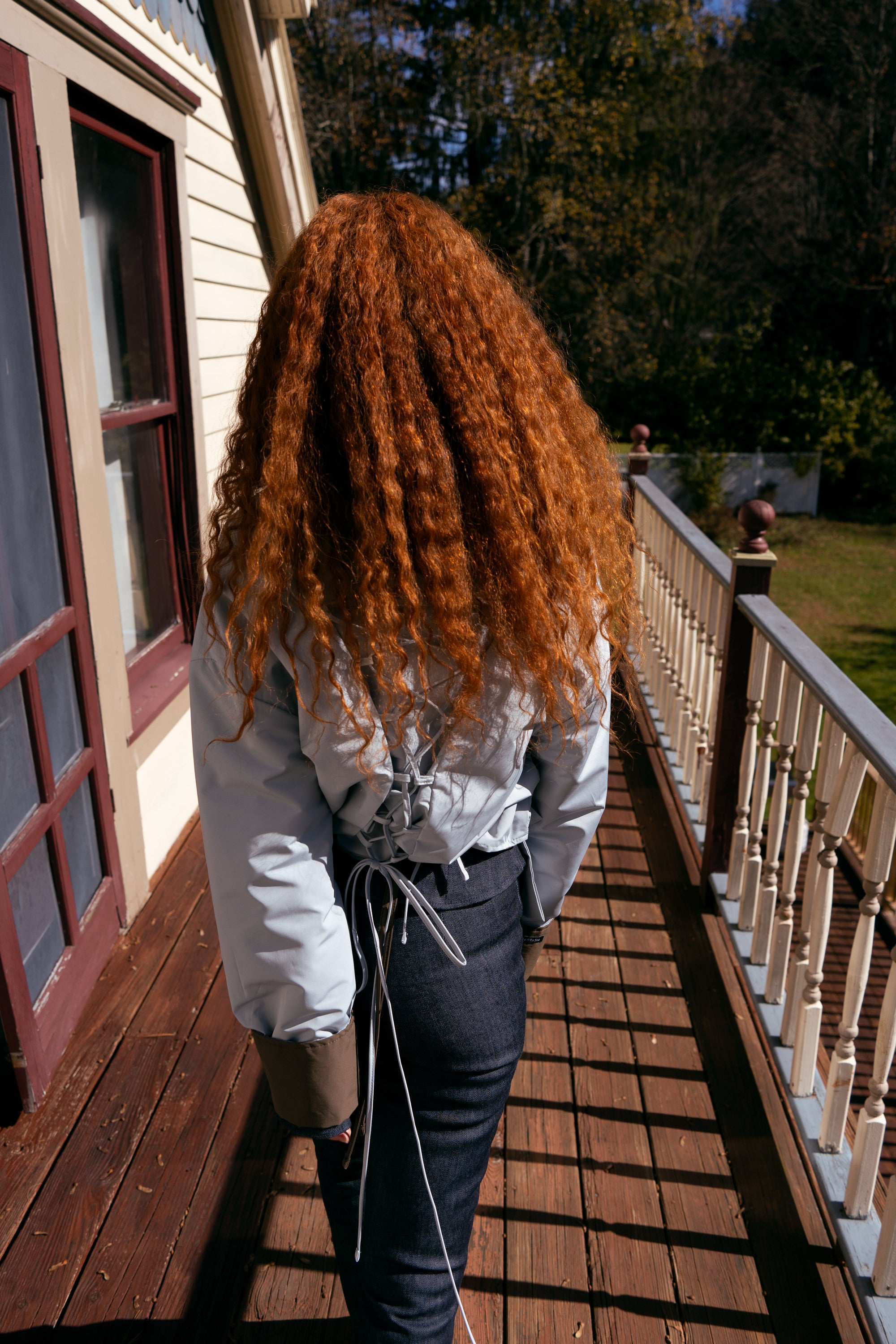 Versatile, water repellent, reversible hip length (extendable) jacket. Dropped shoulders, removable pockets. Adjustable string on the back, foldover collar and full button closure. Made and designed in New York City by Valeria Anastasia and Leslye Rae. Build your coat to your preferable length with the Rain Mini or Rain Skirt (sold separately).