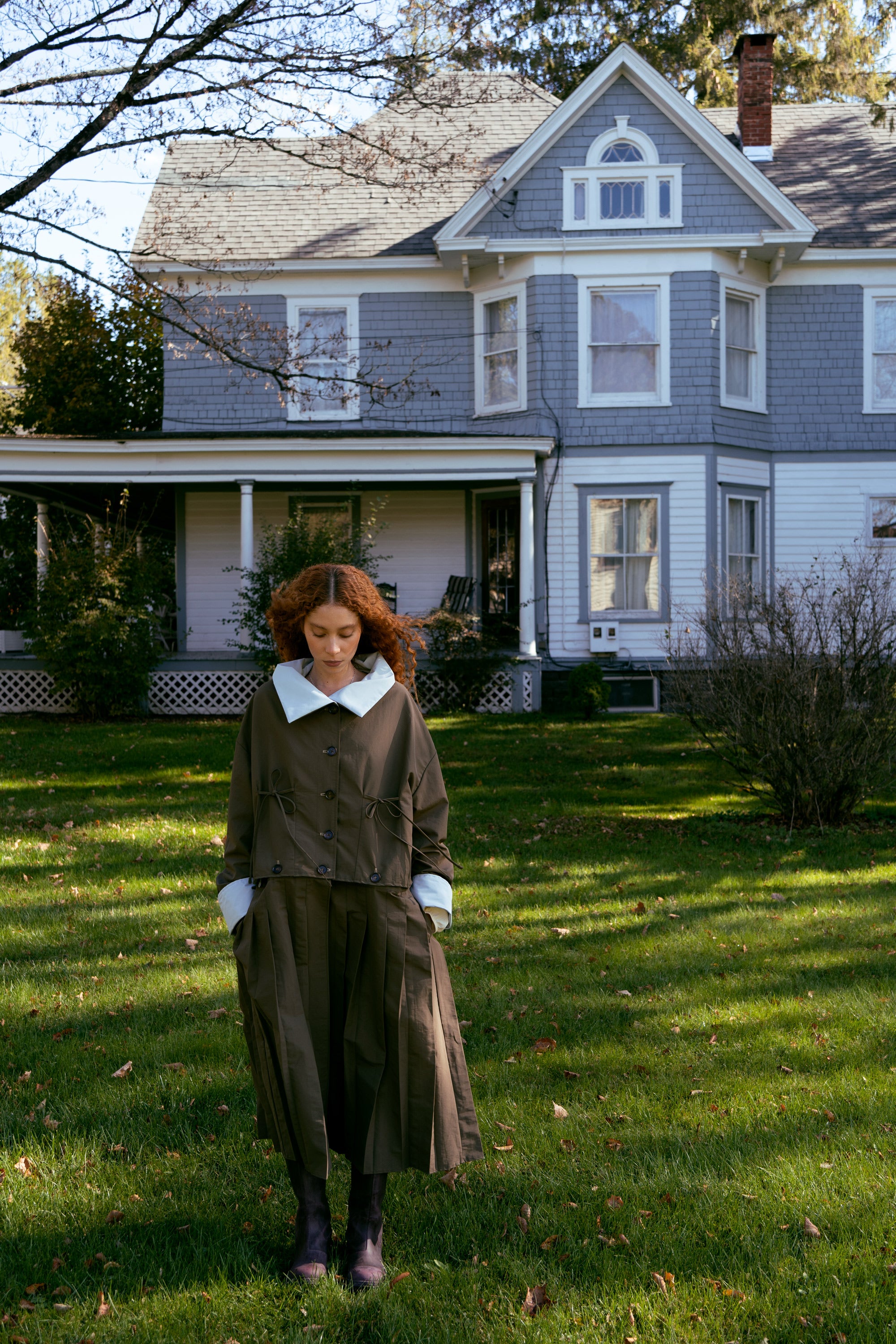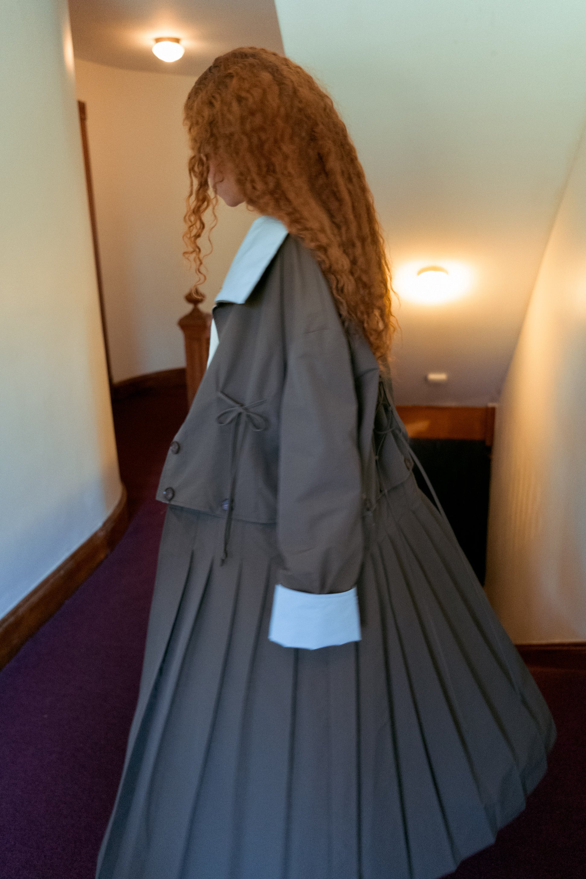 Versatile, water repellent, pleated long skirt add on for your Rain Jacket or to be worn separately on its own. Adjustable button at waistband with pockets. No lining. Made and designed in New York City by Valeria Anastasia and Leslye Rae.